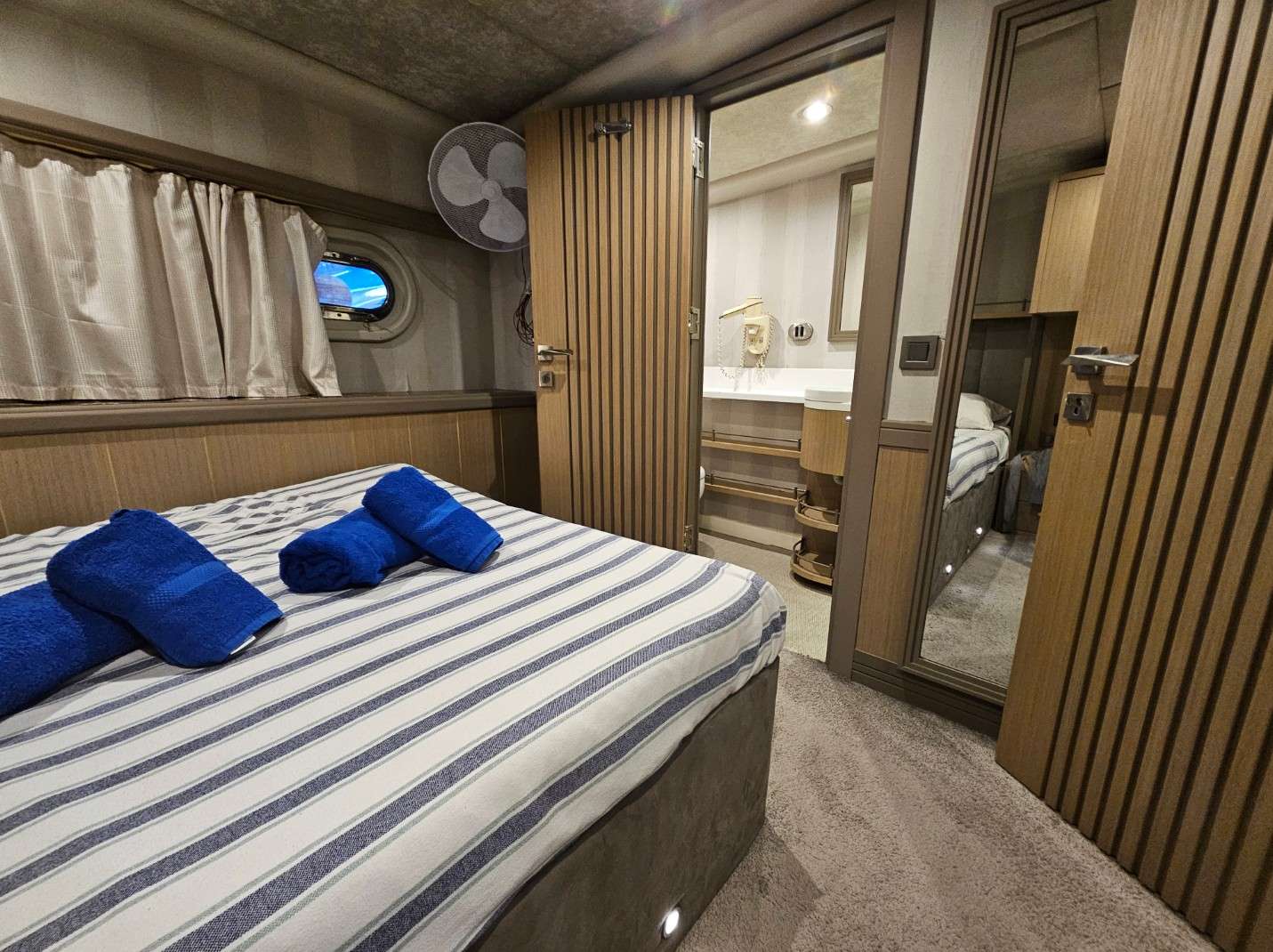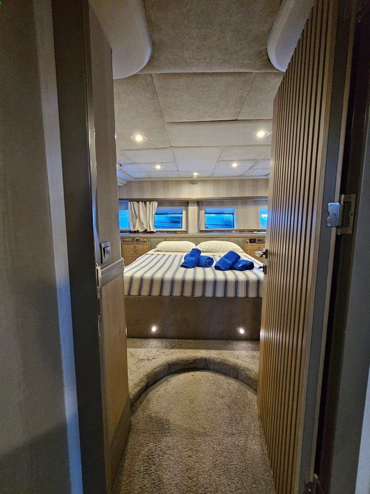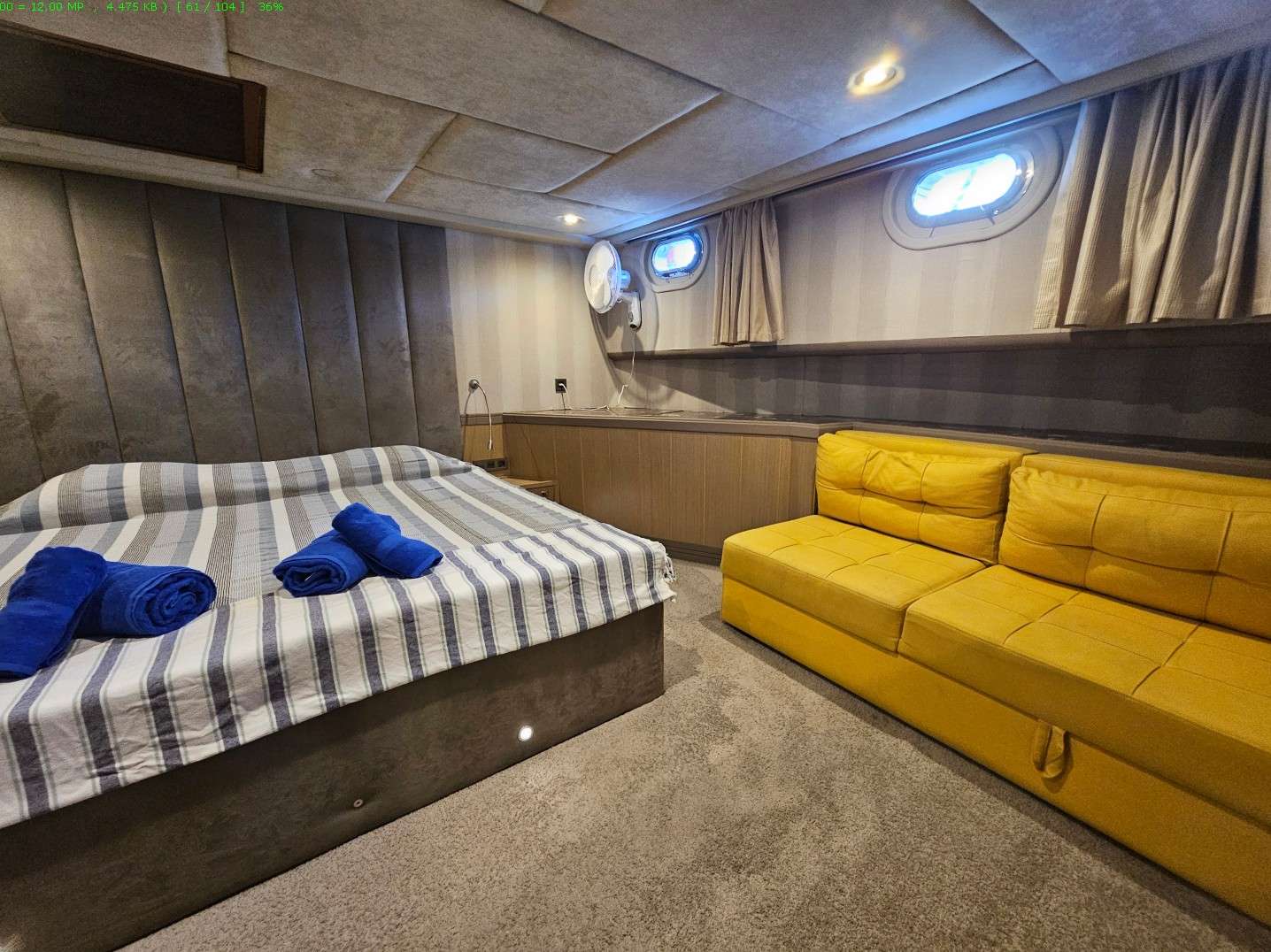 Bed configuration: Aft master cabin: double: 200 x 200 (+ 1 extra bed 185 x 80 if needed), 2 x aft double cabins: 190 x 160, Bow master cabin: 200 x 182, Bow twin cabin: 190 x 85.