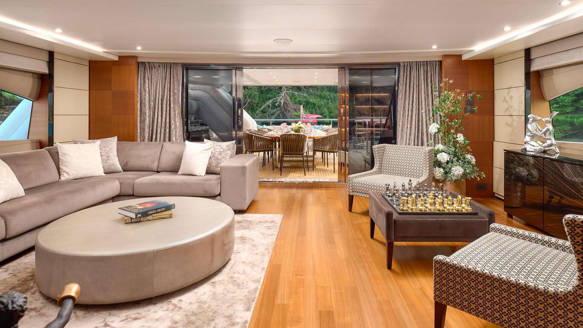Entertainment is at the heart of the MIRAGE IV experience. The yacht is equipped with state-of-the-art televisions in the main saloon and all guest cabins, allowing guests to enjoy movies, TV shows, or live sports in complete comfort.