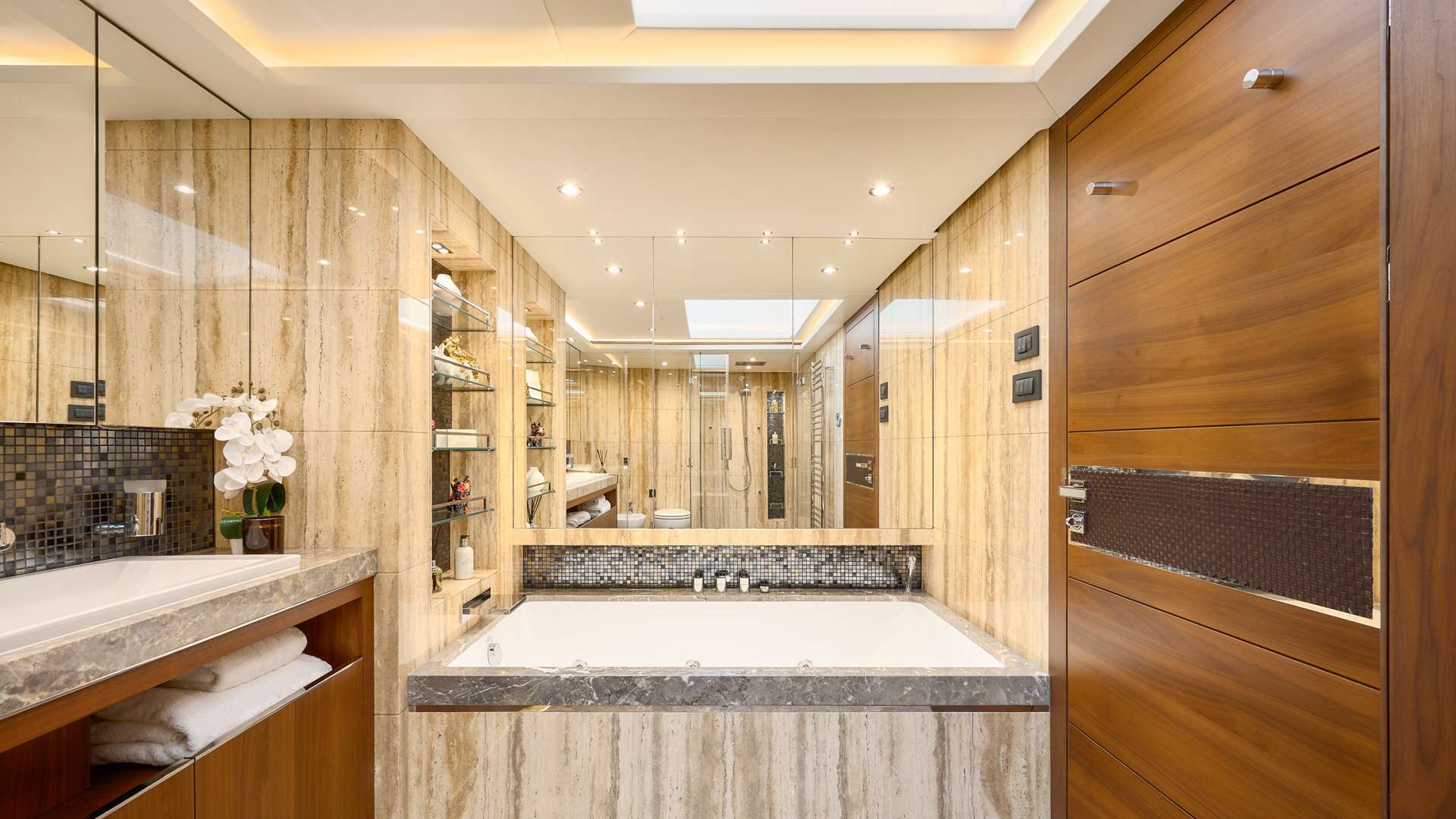 Accommodations: MIRAGE IV is a 40-meter Princess yacht that comfortably accommodates up to 12 guests across six luxurious staterooms. The expansive master suite, situated at the bow on the main deck, spans the full beam of the yacht. This opulent suite features a private office, ample storage space, separate wardrobes for him and her, and an en-suite bathroom equipped with a walk-in shower, ensuring a serene and indulgent stay on board.